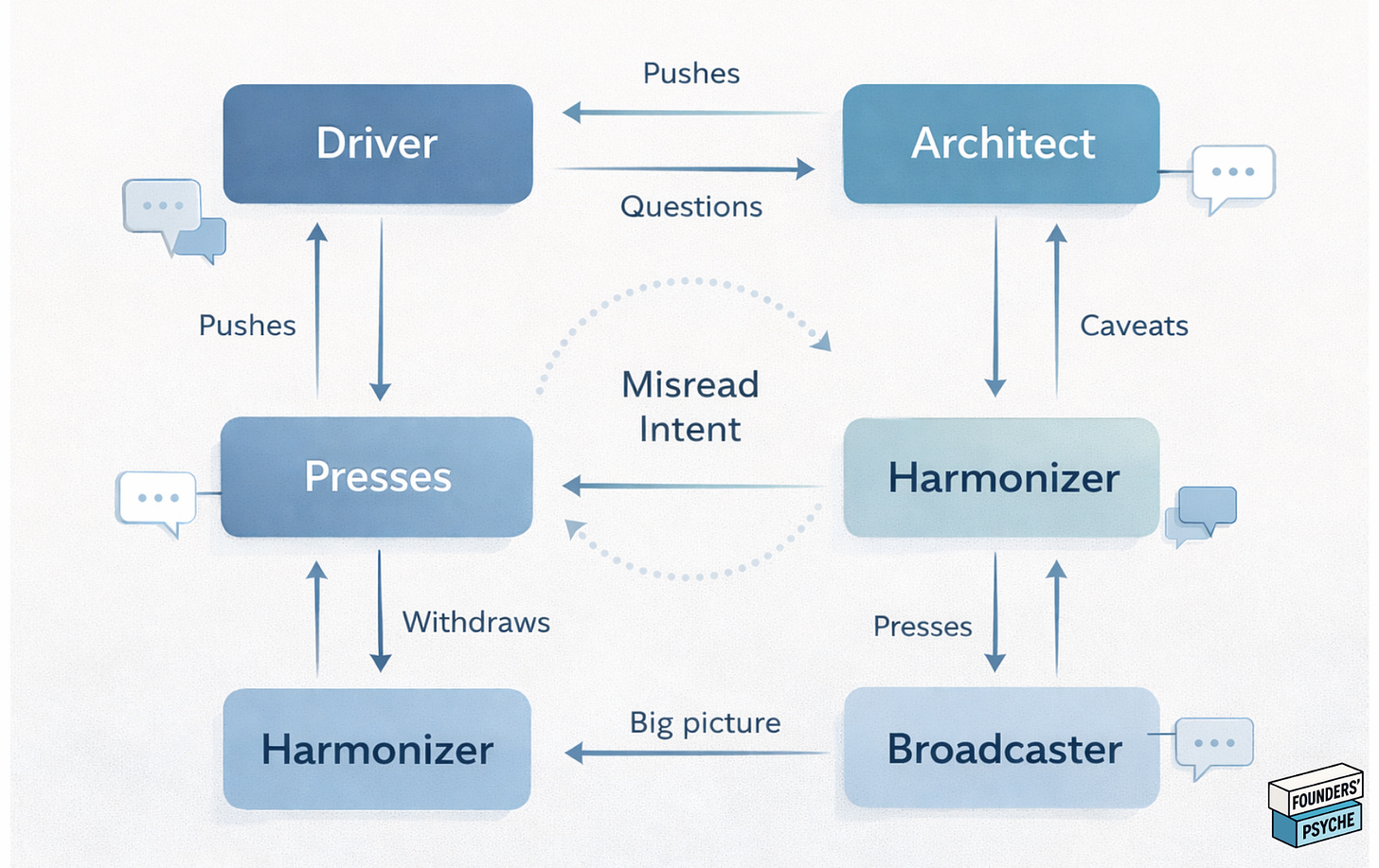 Psychologist Matthew Jones describes this as the “pursue-withdraw” dynamic: one person escalates to resolve the tension, the other pulls back to avoid it, and the cycle feeds itself. The Driver keeps pushing. The Harmonizer keeps withdrawing. No one hears each other. Similarly, when a Visionary Broadcaster gets excited about a new direction, the Architect cofounder raises ten concerns. The Broadcaster feels deflated, the Architect feels ignored, and both leave thinking the other doesn’t respect their contribution.