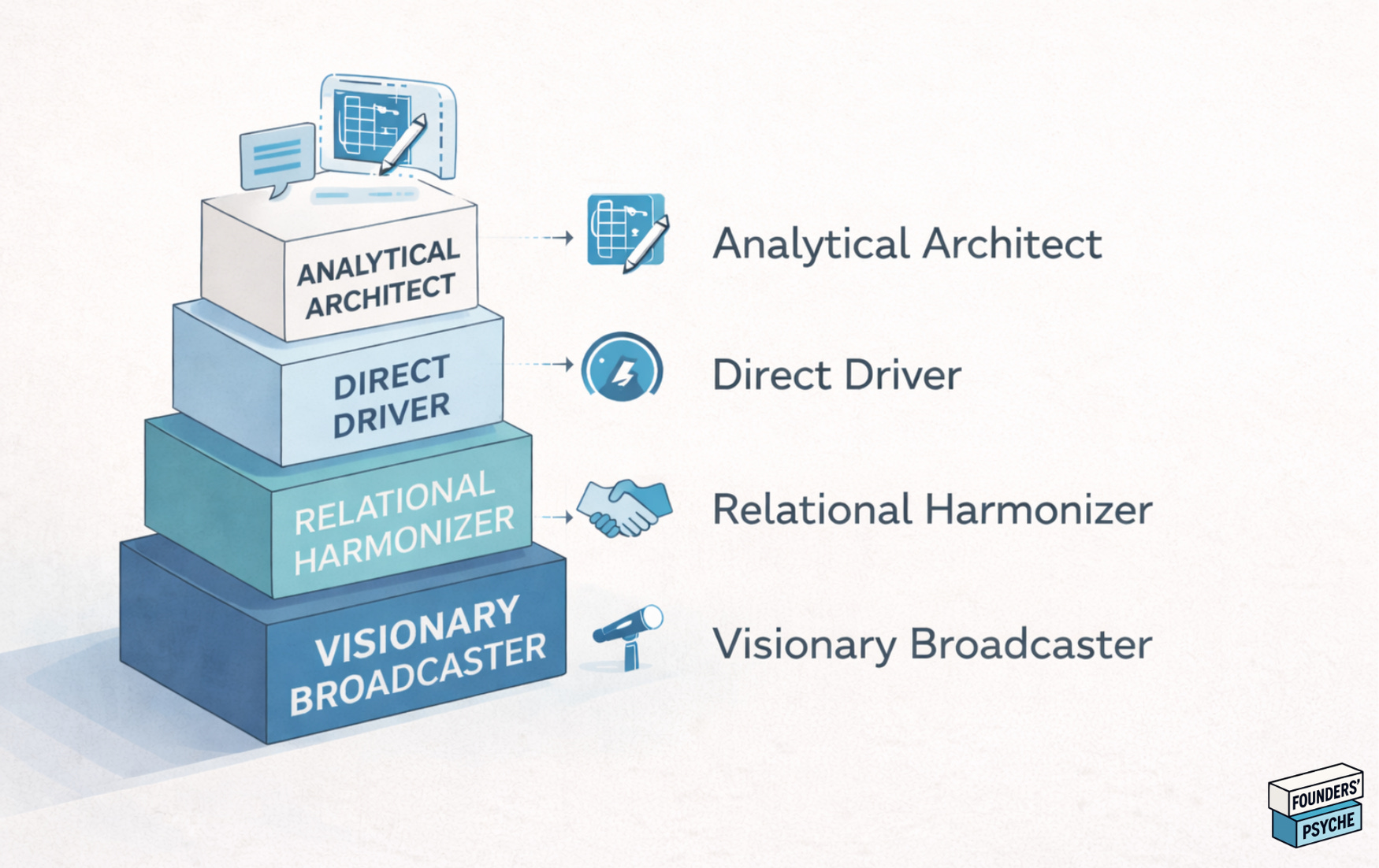 Blind spots: Architects can suffocate momentum. Their need for completeness reads as hesitation to faster-moving cofounders. When an Architect says “let me think about that,” a Driver hears “no.” Their communication style, loaded with qualifiers and conditionals, can feel evasive or unconfident. Investors sometimes misread this carefulness as doubt about the vision itself.